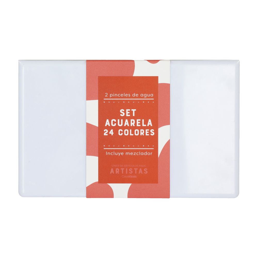 Set de pinturas de acuarelas para hacer manualidades y desatar tu creatividad. Contiene: 1 caja con 24 colores de acuarela, 1 mezclador, 2 pinceles de agua.