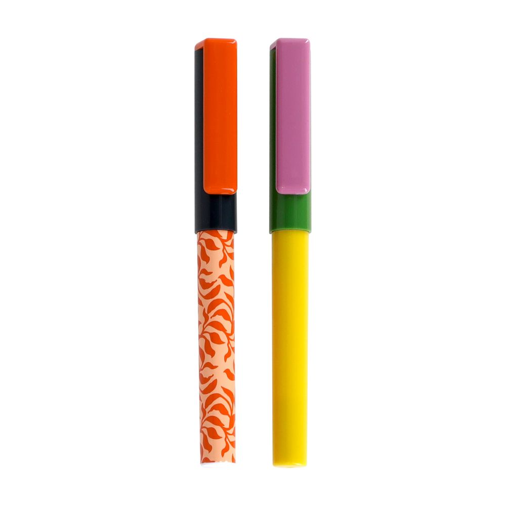 Set 2 bolígrafos de plástico con diseño y tinta azul. Los bolígrafos tienen punta redonda