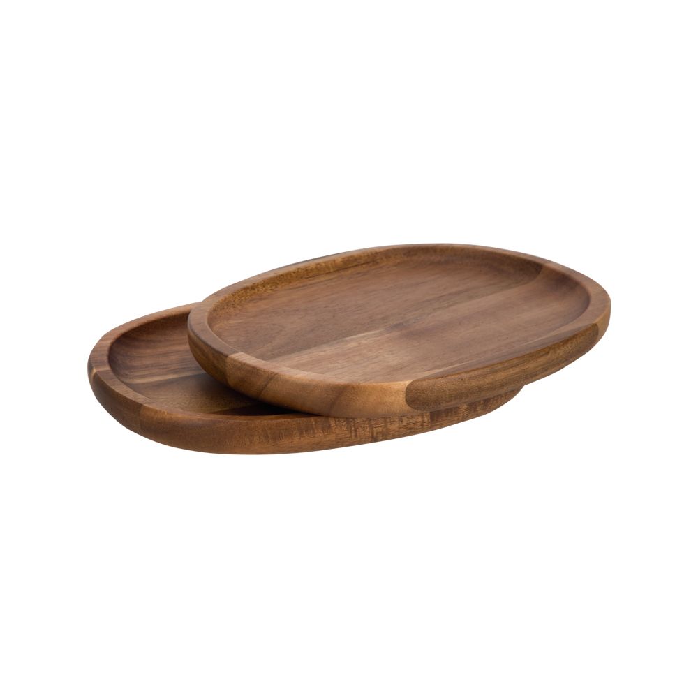 Set de dos Platos ovalados de madera de acacia. Ideal para cocteles. Cada uno tiene un tamaño de 14x17x1.5 cm.