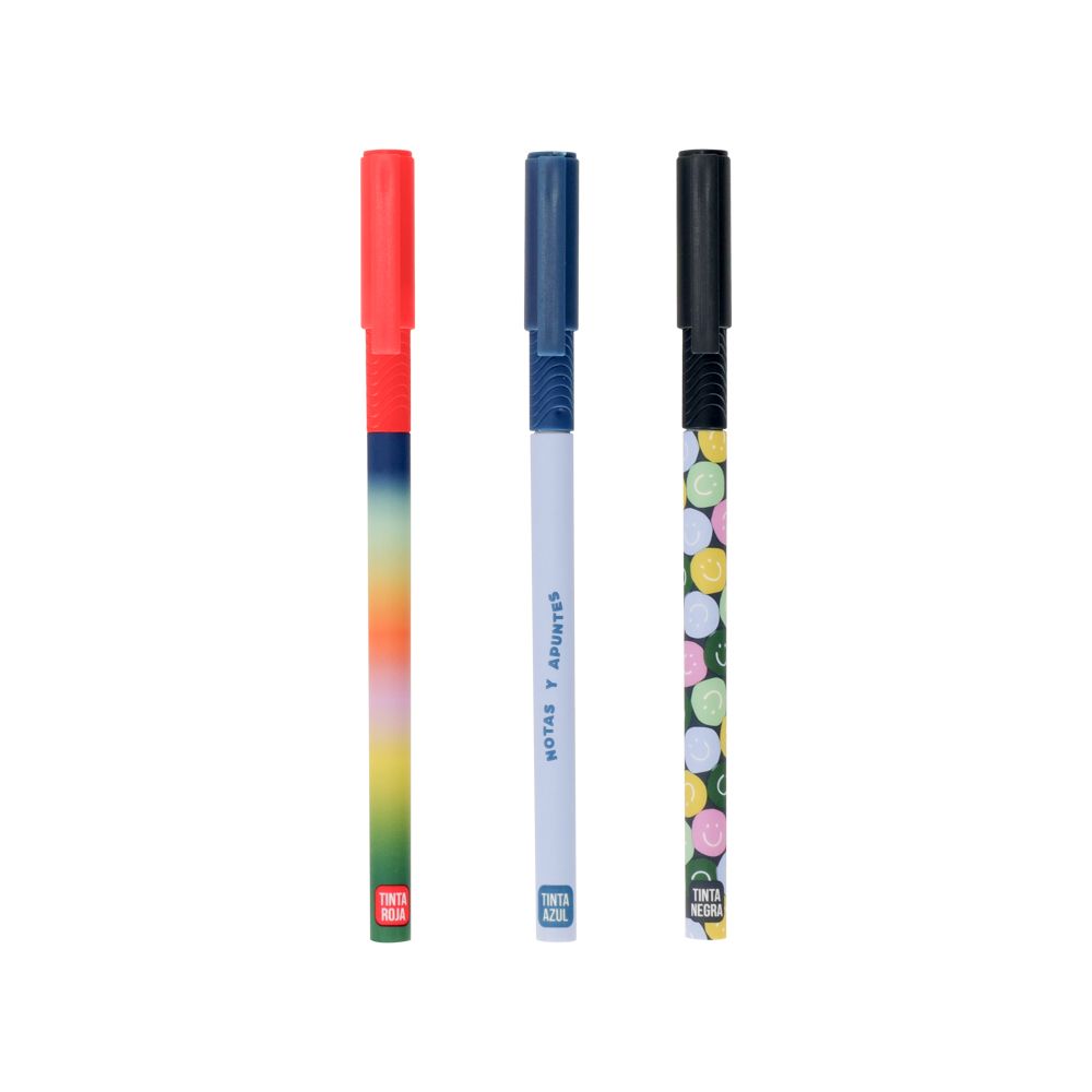 Set 3 bolígrafos con punta redonda y tinta borrable. Borra la tinta con la goma en la parte superior del bolígrafo. Incluye: 1 bolígrafo con tinta azul. 1 bolígrafo con tinta negra y 1 bolígrafo con tinta roja.
