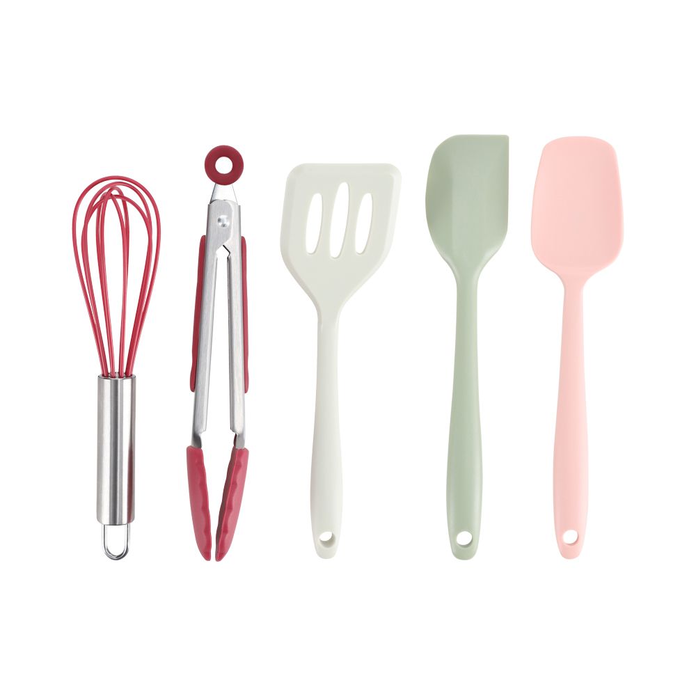 Set de 5 utensilios para hacer repostería. Incluye: Batidor, espátula tipo cuchara, espátula con ranuras, espátula para repostería y pinzas.
