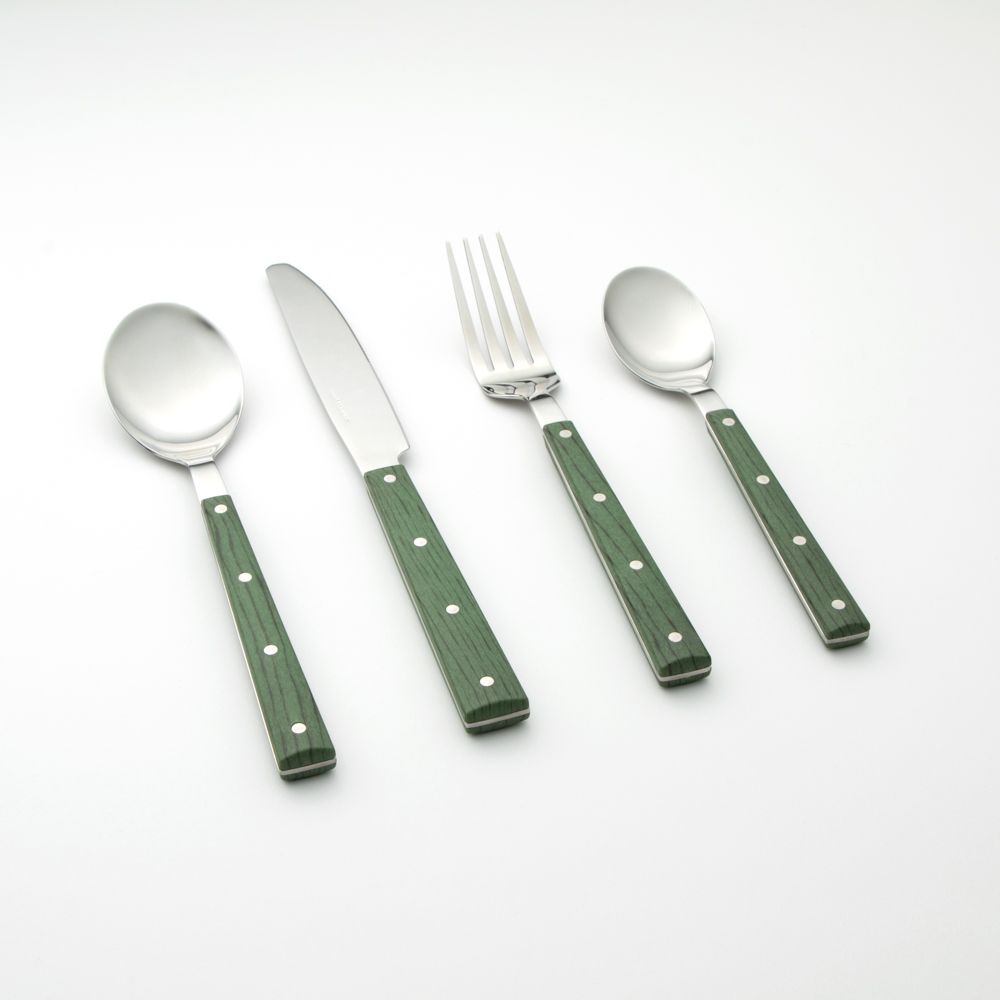 Set de cubiertos de acero inoxidable con base de madera. Incluye tenedor, cuchillo, cuchara sopera y cuchara de postre. Set con un total 24 piezas.