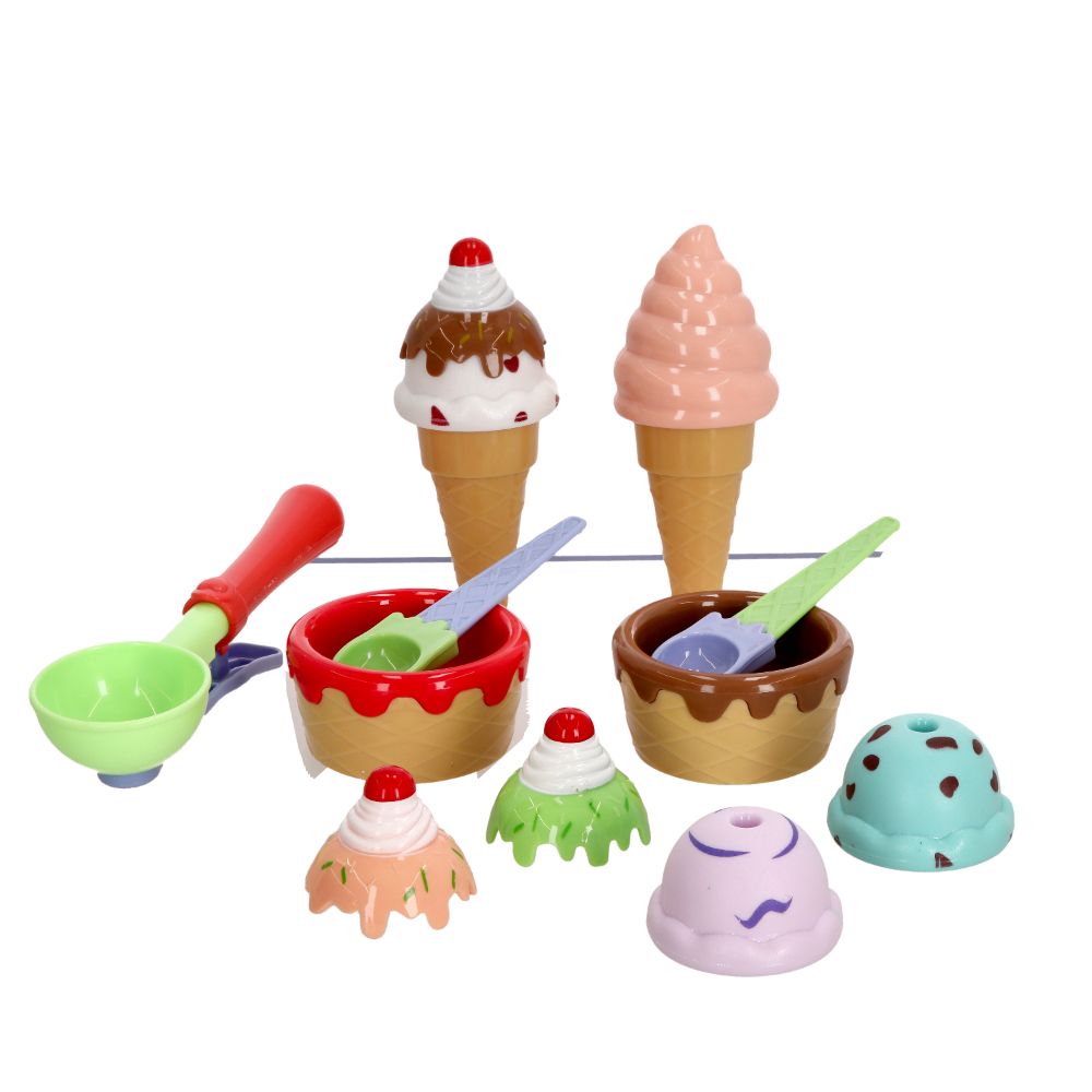 Set de helados para jugar. Apila las figuras y combínalas como quieras para crear tus helados favoritos. Contenido: 2 cuchara para helados, 2 conos de helado, 2 conos de helado pequeños, 4 sabores de helado apilables y 3 decoraciones de helado. Complem