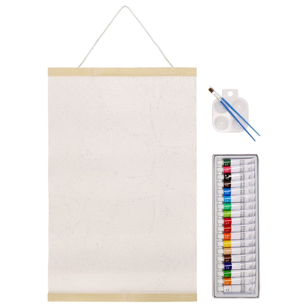 Set de lámina para pintar con colores, con materiales para pintar y colgar tu arte. Incluye instrucciones. Contiene: 1 lienzo ilustrado, con números como guía para pintar, 18 pinturas acrílicas (12 ml cada tubo), 2 pinceles, 2 soportes de bambú con cuerda de algodón listo para colgar.