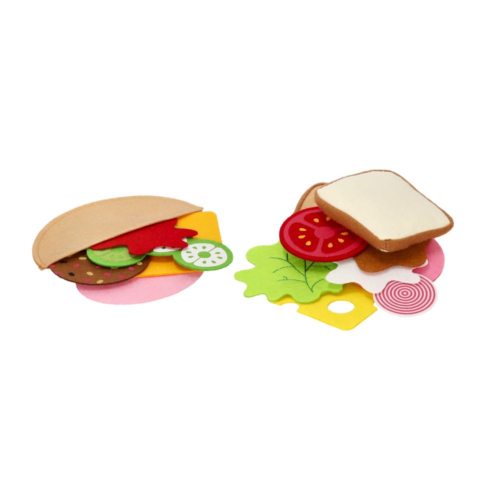 Set de sandwich textil para que tus pequeños lo armen a su gusto. Incluye 16 piezas: 2 panes de sandwich, 1 tortilla, 1 salsa de mayonesa, 1 salsa de ketchup, 1 cebolla, 1 carne, 1 hamburguesa, 2 jamones, 1 tomate, 1 lechuga, 2 quesos y 2 pepinos.
