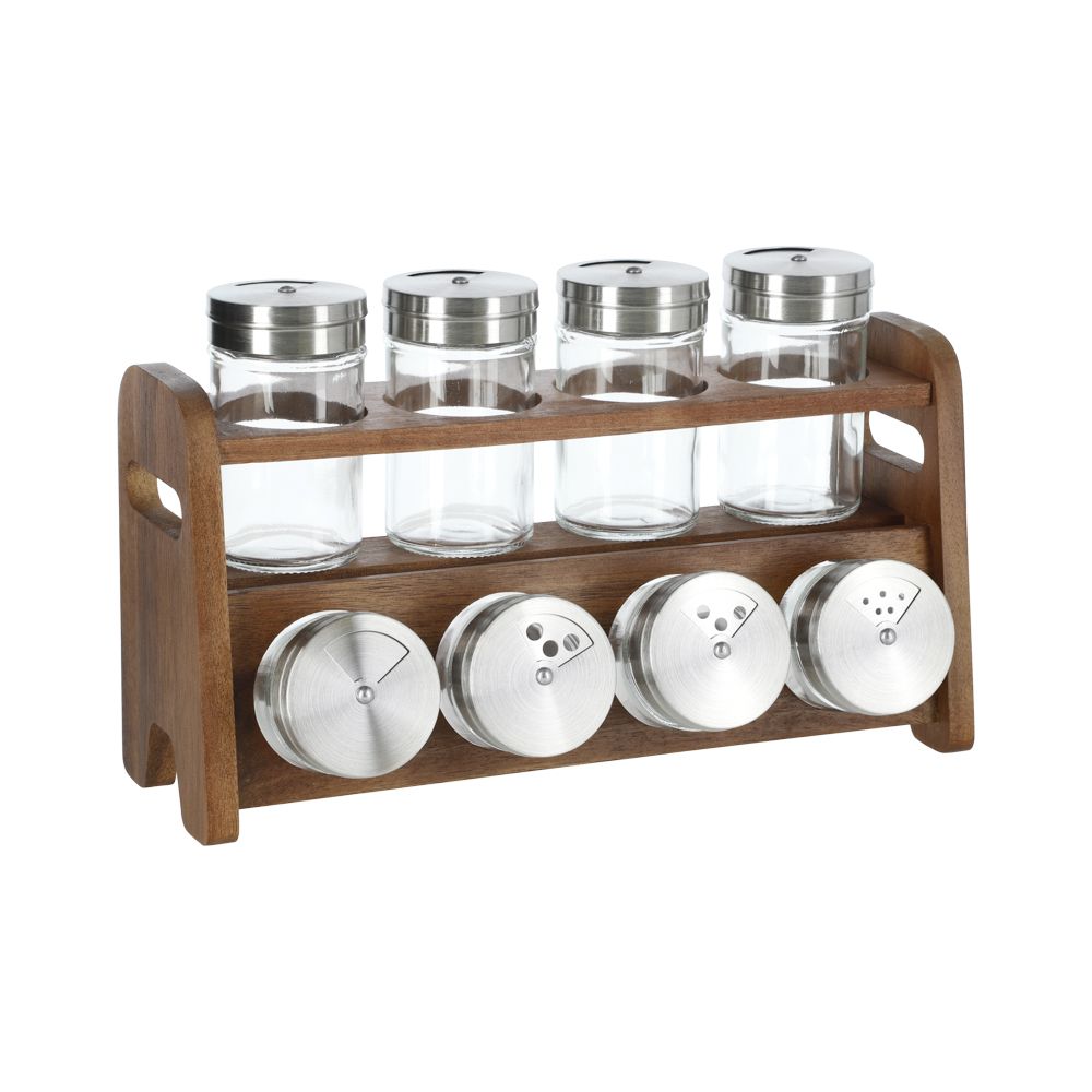 Rack de madera con 8 especieros de vidrio de 90 ml. El rack de madera para guardar cuenta con 2 niveles. 22.5x9x21 cm