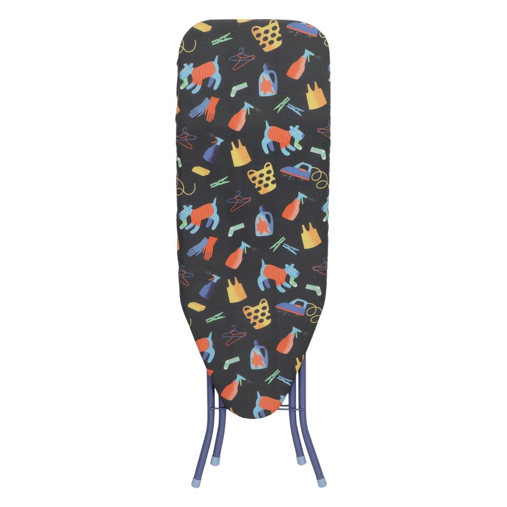 Tabla planchar estructura de metal-resina plástica, cubierta de tela acolchada y patas plegables. Cuenta con 4 espacios para regular altura. Tiene un tamaño de 91x33x81 cm.
