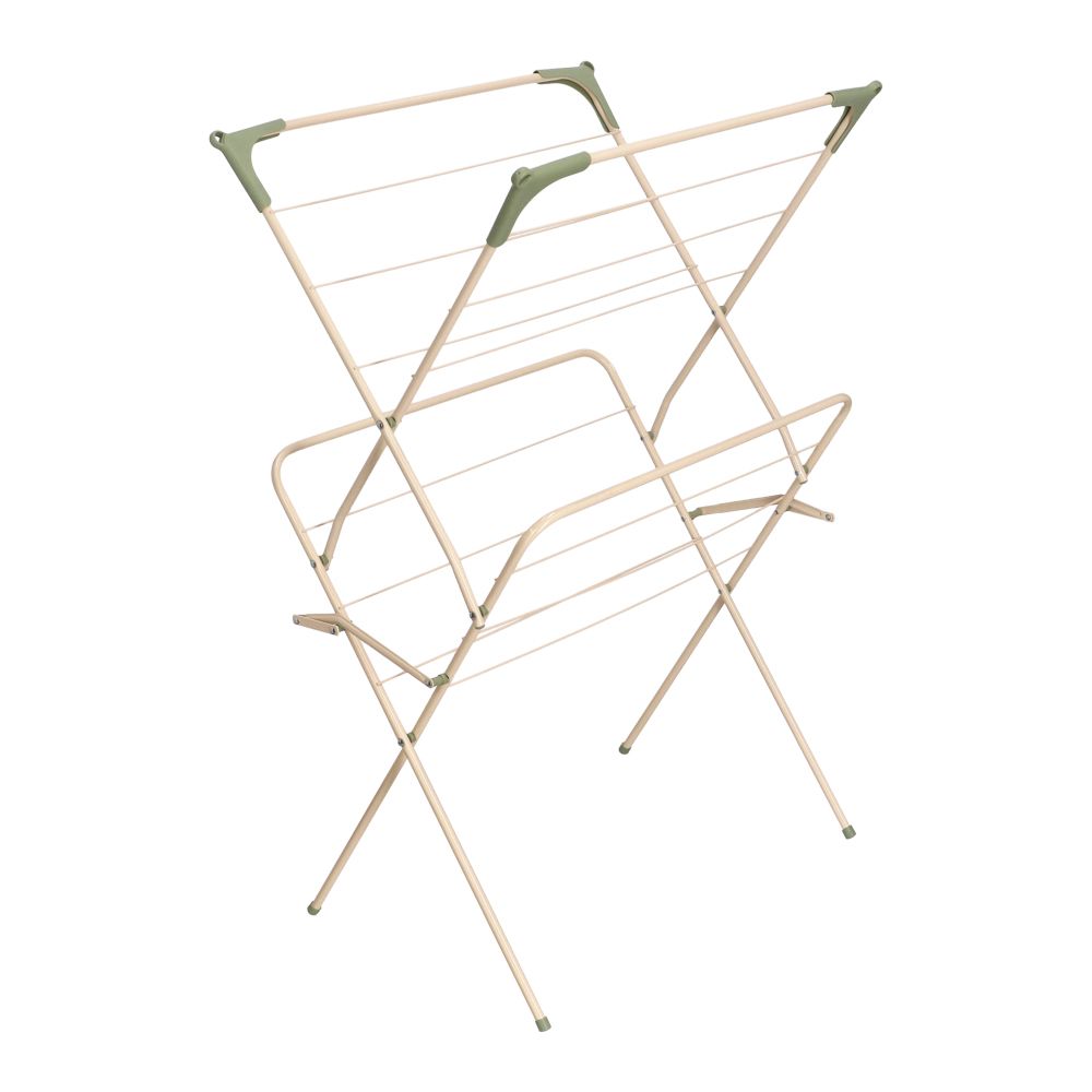 Tendedero metálico plegable de piso con terminación de recubrimiento en polvo. Tiene un tamaño de 63.7x47x100 cm. Soporta hastas 9 kg.