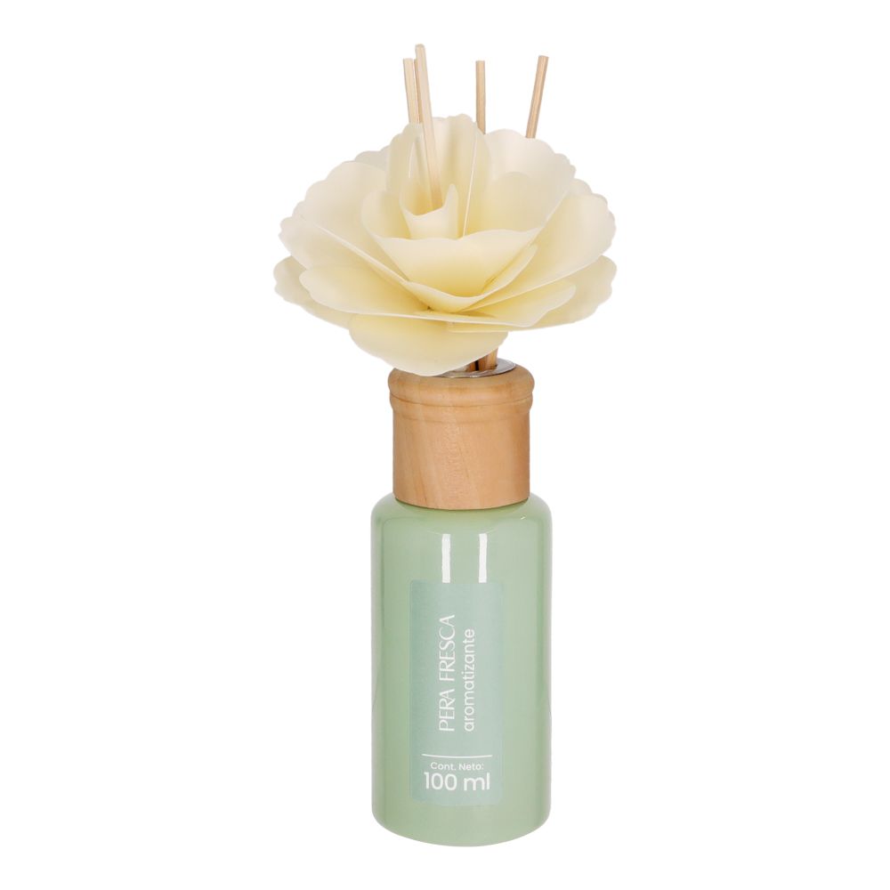 Botella con esencia aromática con aroma pera fresca, flor decorativa de madera y varitas. Perfecta para aromatizar los espacios de tu casa. Tiene una cantidad de 100 ml.