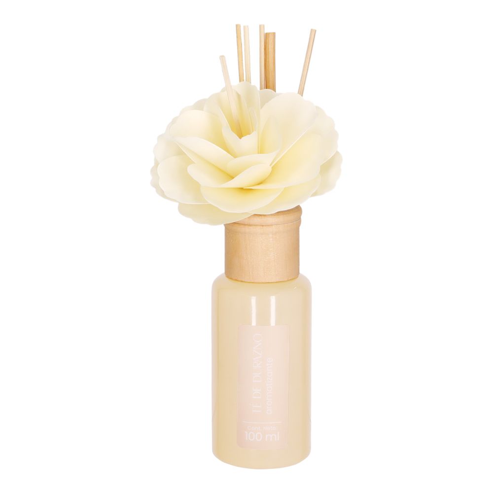 Botella con esencia aromática con aroma té de durazno, flor decorativa de madera y varitas. Perfecta para aromatizar los espacios de tu casa. Tiene una cantidad de 100 ml.