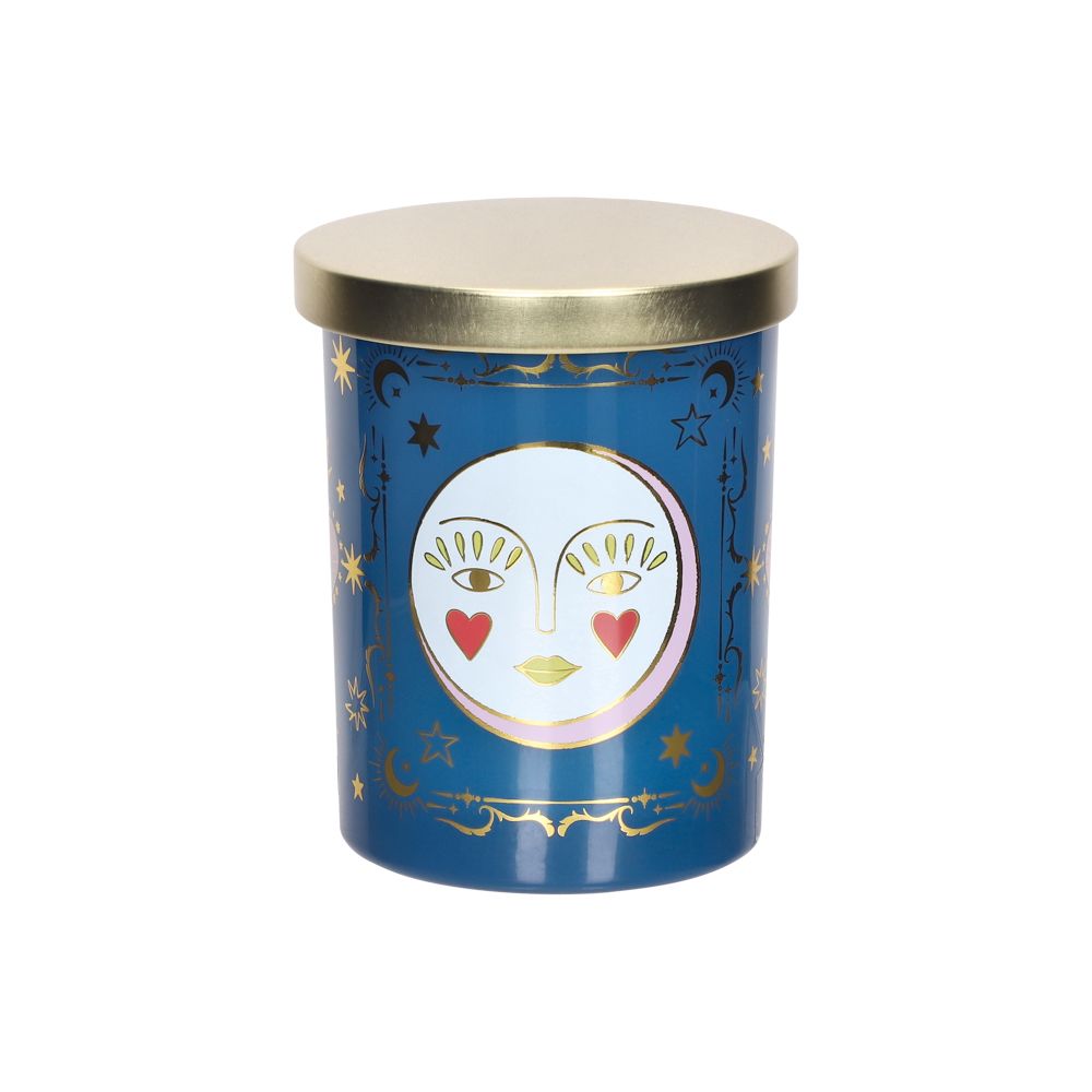 Vela aromática en envase de vidrio con diseño estampado y tapa de metal. Tiene un aroma a lavanda