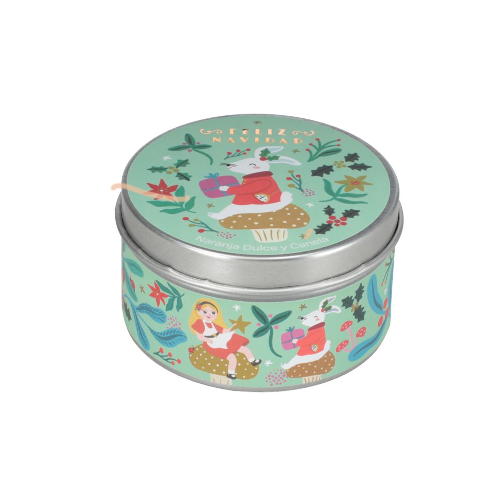 Vela de navidad en lata de metal. Tiene olor a naranja dulce y canela