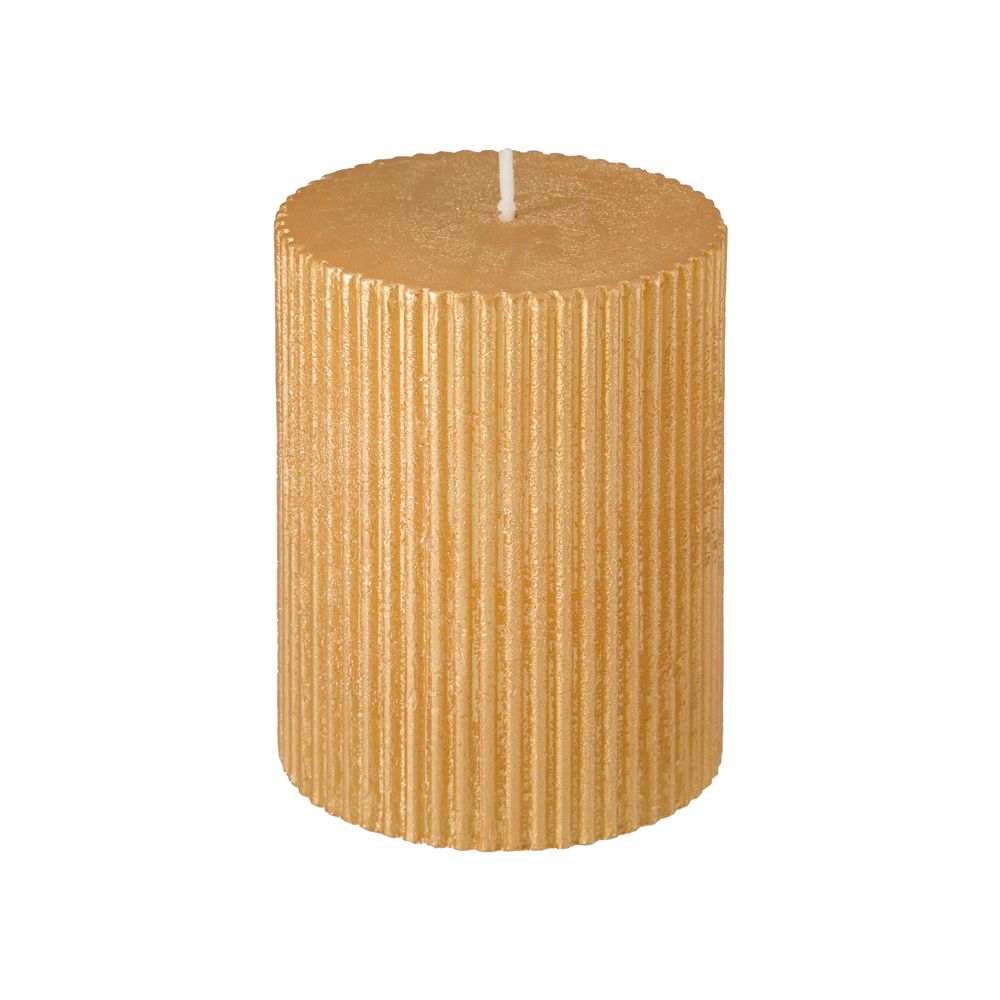 Vela pilar metalizada con colores navideños. Cuenta una duración aproximada de 26 horas. Tiene un tamaño de 6.8x10 cm.