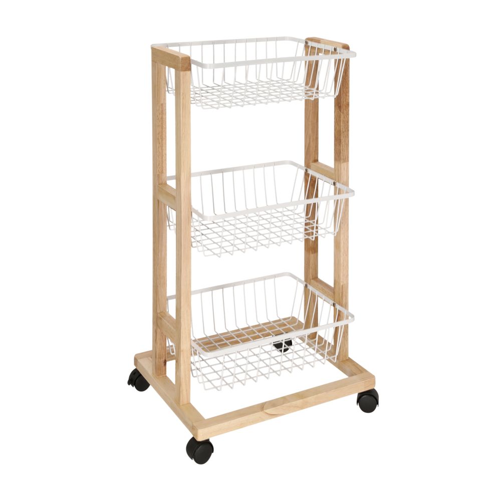 Verdulero de acero y madera de caucho de 3 niveles con ruedas. Tiene un tamaño de 42x35x77.5 cm.